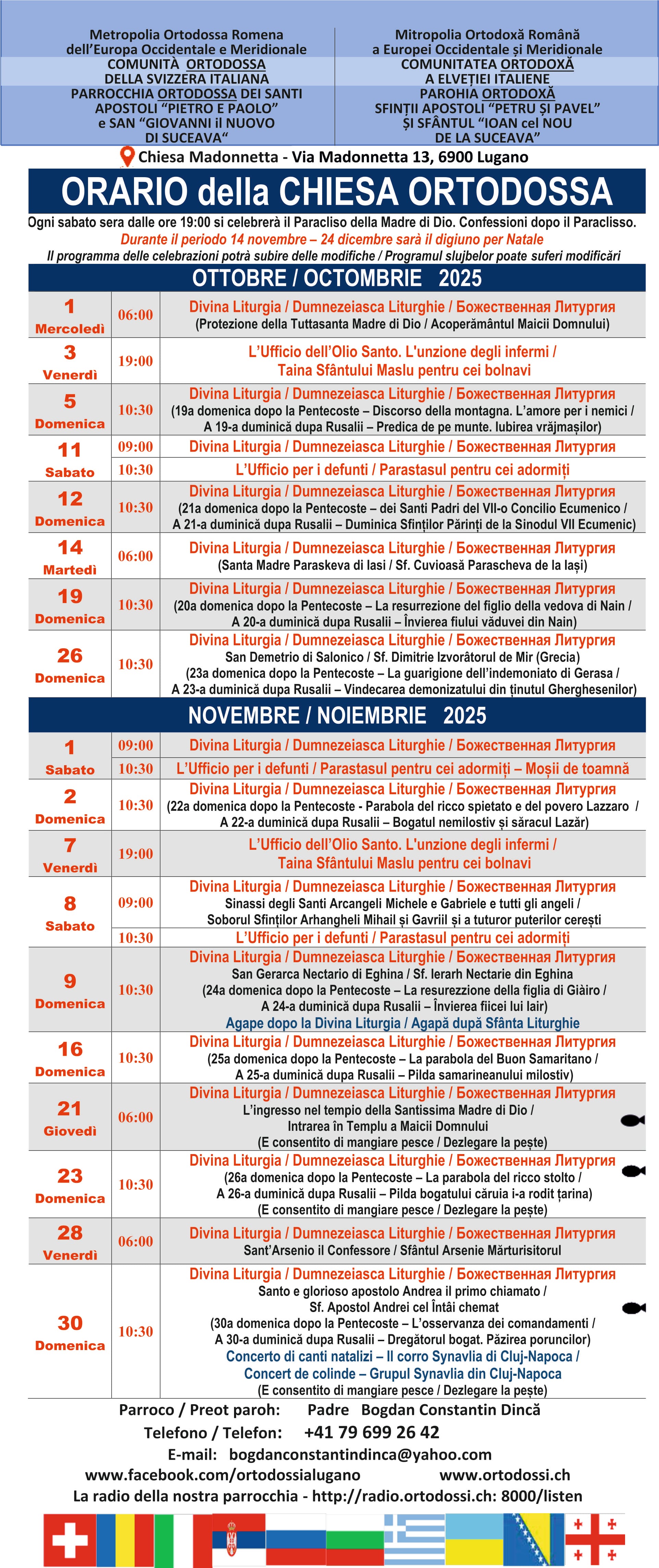 Ogni sabato sera dalle ore 19:00 si celebrerà il Paracliso della Madre di Dio. Confessioni dopo il Paraclisso. Durante il periodo 14 novembre – 24 dicembre sarà il digiuno per Natale / În fiecare sâmbătă seara, de la ora 19:00, vom sluji Paraclisul Maicii Domnului. Program de spovedanie după Paraclis. În perioada 14 noiembrie – 24 decembrie va fi Postul Nasterii Domnului.